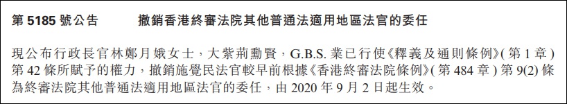 去年七月,行政长官接纳终审法院首席法官的建议,将终审法院非常任法官的任期延长三年至二零二二年七月二十九日,差不多两年后他的任期才被撤销。
